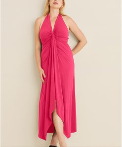Allover graceful folds and draping flatter your shape while sash ties at the halter neck and center front allow for a custom fit. The hanky hem on this maxi dress matches to the deep V neck and stays true to the flowy feel. Pull on this stunner and make an entrance at your next event.* Sizes: XS (2). S (4-6). M (8-10). L (12-14). XL (16)* Plus sizes: 1X (18-20). 2X (22-24). 3X (26-28)* Sleeveless* Plunging V-neck* Knot front detail* Halter tie closure* Handkerchief hem* 59 approx. length; varies by size * Does It All Jersey (Poly/viscose/elastane. Imported)