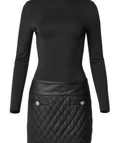 Get the top-and-skirt look without having to play matchmaker in this mini dress that looks like two! The edgy faux-leather quilted skirt sits low on the hips and has two large button details. giving your torso that long and lean look. The mock-neck long sleeve top assures a smooth. monochrome silhouette.* Runs large; size down for a better fit* Keyhole cutout and button closure at back of mock neck* Quilted skirt with button and faux pocket detail* Hits mid thigh 34* Rayon/nylon/spandex. Imported